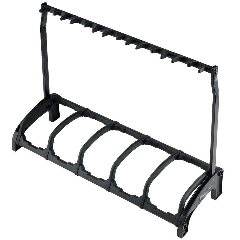 Holds 5 guitars securely, saves space and allows you an easy overview of your guitars. Ideal for use in the studio, on stage in a shop or at home. No matter whether you have acoustic, electrical or bass guitars, the special instrument-compatible supports protectively hold max. 5 guitars. The protective bars stop the guitars from rotating and prevent inadvertent removal or knocks or bumps when taking the guitars from the stand or placing them. The soft pads made of high quality thermoplastic elastomer have cushioning characteristics. Therefore they protectively take the weight of the guitar and avoid damages of the instrument. The innovative folding mechanism used on the - Guardian« allows the stand to be carried easily and it can be left standing upright. Highly flexible, sub-divided support arms with integrated pick holders mean the guitar can be held from either side (right or left) and that the strings are untouched. The structural design allows the - Guardian« to be positioned against a wall.