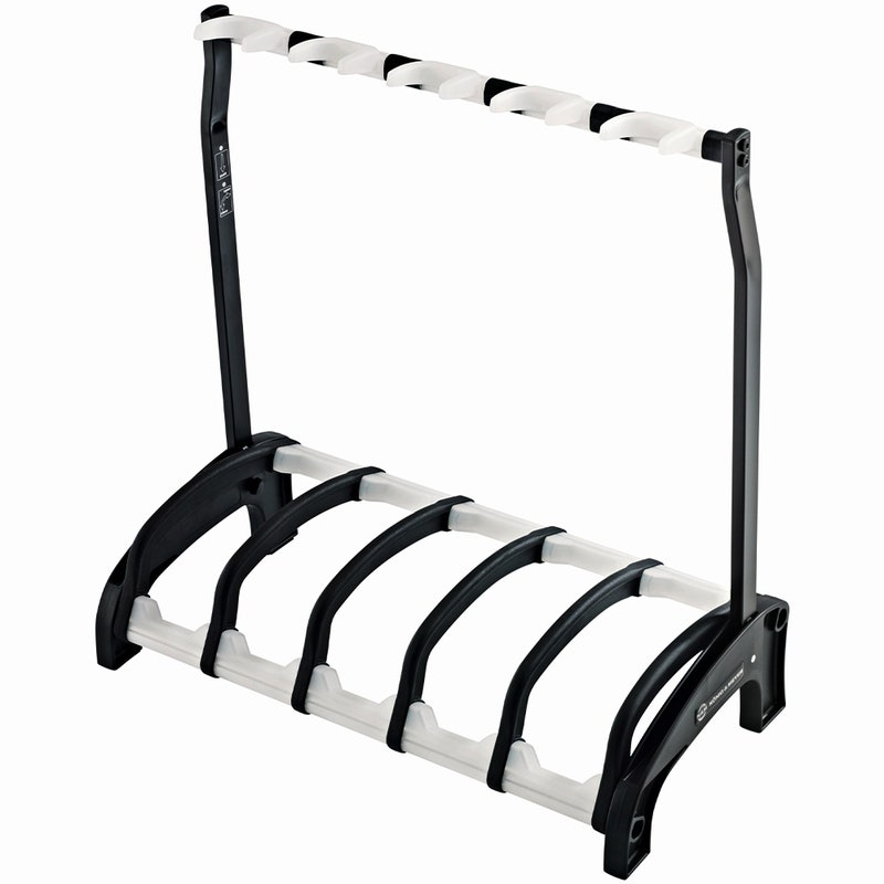 Your "sweet hearts" are taken good care of in this exclusive guitar stand. Be it in the studio, on stage, at the store or at home. Guardian securely holds up to 5 E-guitars or base guitars, saving space. Guardian provides the musician with an excellent overview over his instruments. Specifically adjusted and cushioned rests provide a secure and protective grip. The flexible protective arms protect the guitar from moving and provide protection when putting down or picking up the guitar from mistakenly hitting the frame of the stand. The soft pads are equipped with cushioning qualities. They softly support the guitars weight and avoid any damage to the instrument. The Guardian is easy to transport and carry and thanks to an innovative folding mechanism, it can even be stored in an upright position. Flexible, proportioned system arms with integrated pick holders allow the guitars to be put down both on the right or the left side, and also ensures that the guitar strings are not touching anything.