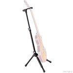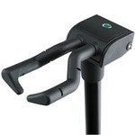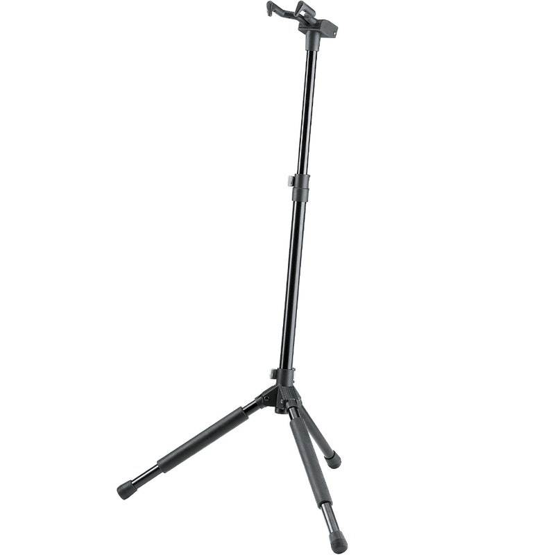 Folding stand for all guitars. Features a patented flexible hooking-in and clamping system which quickly and firmly grasps the guitar neck. Fits most instrument necks. Studs at support arms provide extra protection. Height adjustment with convenient locking levers. Anti-twist feature on the extension rod for extra safety. High quality non-marring rubber on the stand's neck grip and base helps to protect the instrument. Stable robust base.