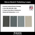 Our custom designed Micro-Mesh® loops are like no other. With 13 square inches (84cm) of polishing area, they are designed to slide on to both Tracer handles and give you a great polishing experience compared to fumbling around with traditional sheets of polishing paper. Micro-Mesh® utilizes an innovative "cushioned" abrasive technology that delivers uniform, floating abrasive crystals bonded to a flexible, resilient cloth backing, giving superior results. They come in 4 Micro-Mesh® grits (1000, 3600, 6000, 12000) that are marked in the order to polish: 1, 2, 3, 4. It can't get any better than that