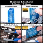 Diagnose with the Fret Rocker+ and Fret Gauge. Spot fret level with our 3 U-Files that file single high frets causing fret buzz. Crown with our revolutionary Diamond Coated Fret Crowning S-File that prevents you from over filing with the small strip at the top of the file where there are no diamonds.