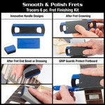 Fix fret sprout with our Fret Beveling B-File, which has the perfect angles 3° and 23°, plus the ergonomic, curved radius handle gives you total comfort and control. The 2 'n 1 adjustable file gives you both a single and double cut. The Diamond Coated Fret End Dressing E-File features two safe edges (slight radius, flat), an ergonomic handle and premium diamonds to fix those sharp fret ends. For the final touch, we give all the fret finishing products to smooth and polish your frets. Our 3 grip guards protect the fretboard while using our 6 pc. Tracers Polishing System.
