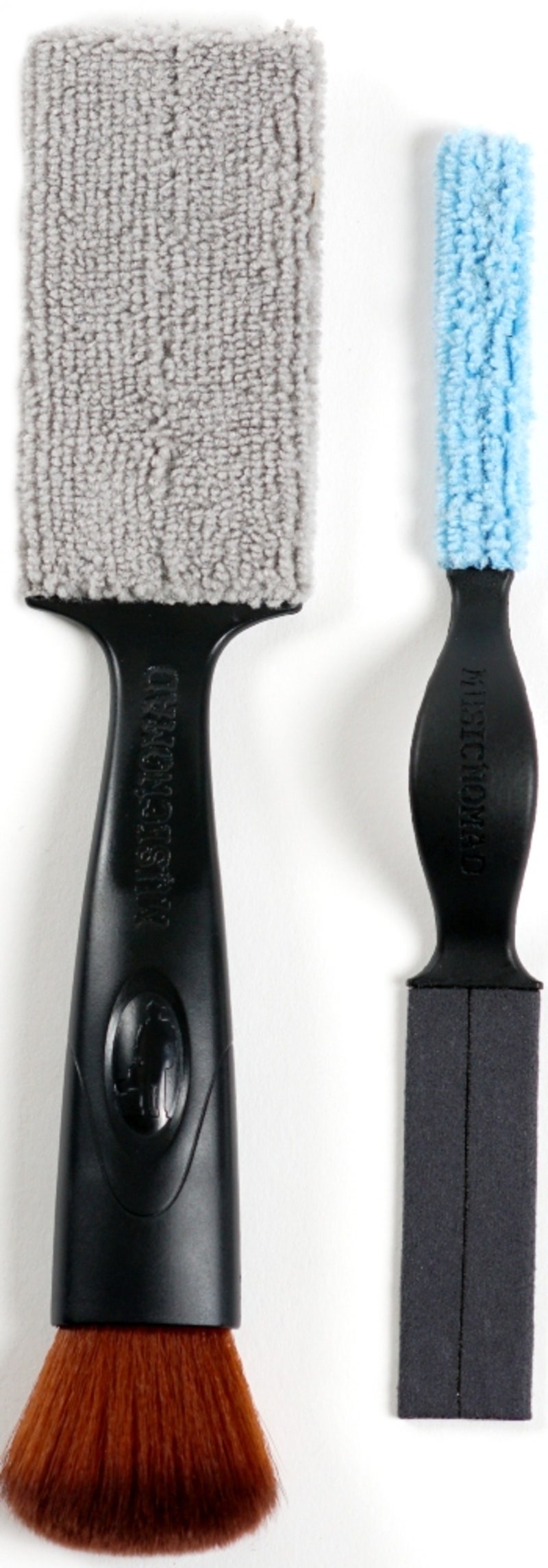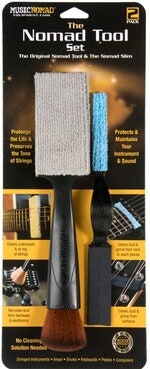 Our innovatively designed and patented Nomad Tool paired with our small yet powerful Nomad Slim is the perfect team to easily maintain the quality, sound and cleanliness of your equipment. The Nomad Tool extends the life & preserves the tone of your strings while keeping the body & hardware looking like new without any cleaning solutions. The Nomad Tool’s microfiber pad cleans on top AND underneath guitar strings in seconds. The dual sided microfiber pad protects the frets and fretboard from damage when cleaning underneath your strings while at the same time cleaning them. The Nomad Tool’s large pad is also great for removing dust, grime and fingerprints on the instrument’s body and hard to reach areas. The super soft, brush fibers on the opposite end helps you guard against dust buildup and provides delicate care for the body, bridge, pickups, saddles, tuners, headstock and more. Trying to clean those hard to reach areas? The Nomad Slim gives you the ability to get in between pick-ups and under floating bridges, floating pick guards, strings on your headstock and more. Cleaning off dust & grime is a critical step before you apply any polish to avoid scratching the finish. The Nomad Tool and Nomad Slim can be used on all electric and acoustic stringed instruments, drums, mixers, computers, pedals and more.