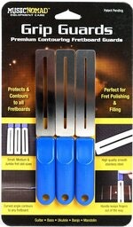Polishing frets and other fret work just got a whole lot easier with MusicNomad's patented GRIP Guards. The premium fretboard guards are made using a high precision process that produces a very smooth finish on our high quality stainless steel material, which is nonmagnetic, corrosion resistant and heat resistant. The special engineered curved angle contours to all fretboards. The innovative ergonomic handle makes any fret job easier, quicker, and keeps your fingers from getting in the way. The set of 3 GRIP Guards works on all string instruments and includes 1 each for small, medium and jumbo fret slot sizes. The ideal width lets you work up and down any fretboard whether a guitar, bass or even a ukulele.
