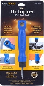 Forget lugging around a bunch of screwdrivers, nut drivers & wrenches when The Octopus 8 'n 1 Tech Tool can handle the job! MusicNomad's patented, innovative design is perfect for tightening or loosening output jacks, control pots, tuning machine bushings & screws. It features both a Phillips & flat blade screwdriver with our reversible shaft design and is engineered for the most popular hex wrench sizes: 10mm, 12mm, 14mm, 1/2" & 7/16". Remove the screwdriver and use the 1/2" narrow profile hex wrench for tightening sunken pots and Tele cups. Just say no to metal. Our hex wrenches are made with strong ballistic nylon material that can handle any job without the worry of scratching your hardware or finish. Small in size but big in results our 6"/15cm overall length is a must have for every guitar case.