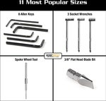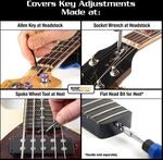 Designed to work on most electric, acoustic, and bass guitars this 11-piece set comes with 6 Allen Key sizes, 3 Socket Wrench sizes, a specially designed Spoke Wheel tool and a 3/8” Blade bit.