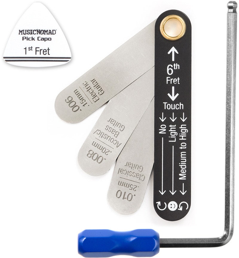 Being able to measure and adjust your MARTIN® Guitar's neck relief is a critical step in the setup process and will improve your playability and sound. MusicNomad is making it real easy for anyone to perform this task with our Measure and Adjust kits. The Precision Truss Rod Gauge comes equipped with the 3 most common relief measurements for Electric, Acoustic, Classical and Bass Guitars (.006”, .008”, .010”). For MARTIN®, use the .008" Gauge along with the clever Pick Capo and follow the instructions printed right on the gauge. When you are ready to adjust, MusicNomad's 5mm Premium Truss Rod Wrench is made custom to fit all models of MARTIN® Guitars truss rod nut that you adjust inside the soundhole except DSS-2018, OMSS-2019, Modern Deluxe Series and SC-13E. Our ergonomic handle and rubber protective bumper gives you the comfort around your prized instrument. Keep your Gauge close by as it works on any Guitar or Bass and the 5mm Wrench will work on other Guitar brands that require that size. Make sure you check out all MusicNomad's Precision Gauges and Tools used in the setup process. That's MusicNomad quality – raising the bar in equipment care.