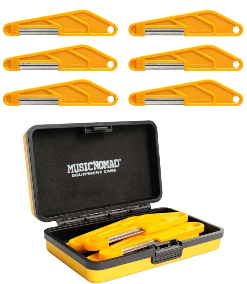 MusicNomad’s patent pending Nut Files feature a revolutionary diamond coating & round “string-shape” blade design resulting in smooth, precision cuts. They cut & polish slots at the same time & do not drift like common toothed files. The industrial, even diamond coating cuts & polishes all the most common nut materials such as nylon, bone, graphite & TUSQ. They even work amazing on saddles. We added an ergonomic handle for total comfort & control of your cut, or you can remove the blade from the handle as an alternative cutting option. This custom set comes with 6 Nut File sizes for Electric Guitar - Light Strings. We even include a compact, strong aluminum case. That’s MusicNomad quality – raising the bar in equipment care.