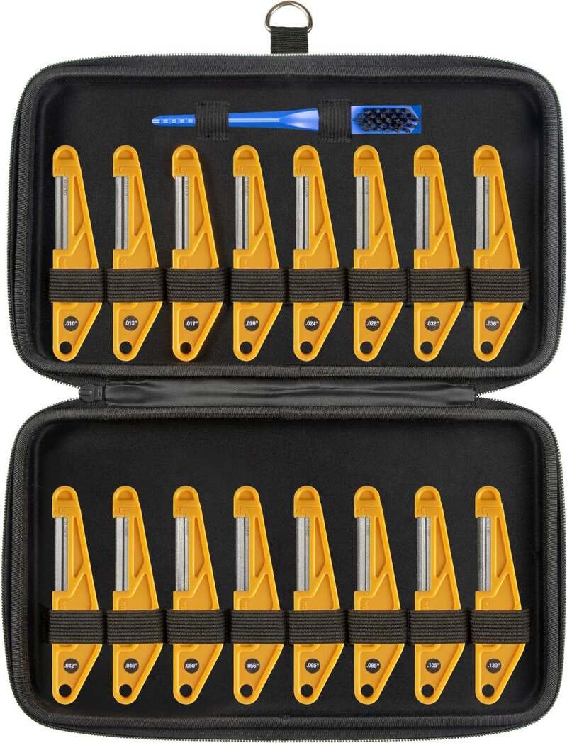 The Entire 16 Piece Nut File Set Perfect for any Job, any Instrument. Includes: .010", .013", .017", .020", .024", .028", .032", .036", .042", .046", .050", .056", .065", .085", .105", .130". Comes with an Organizational Storage Case and a Handy Cleaning Brush: 12" x 7" x 2"