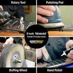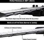 There is nothing like peace of mind while saving time and money. MusicNomad's patent pending Fret Shield sets a new higher standard for total fretboard protection when performing fret work such as polishing, leveling and crowning. Say "NO" to blue tape with our reusable design that goes on in seconds, fully protects without damaging the fretboard and lasts 100's of fret jobs. Our high quality stainless steel is the perfect thickness at .008" (.20mm), uses a precision manufacturing process free of burrs, and leaves all edges smooth and rounded. Our innovative formed drop-down edges allow the rubber bands we include to hold the Fret Shield in place securely and keep the bands below the top surface to avoid damaging them during the polishing process. Fret Shields come in the most popular Fret Scale sizes and even include a convenient hang hole. Whether your fretboard is finished maple or unfinished rosewood with inlays, your board will thank you for protecting it. That's MusicNomad quality - raising the bar in equipment care.