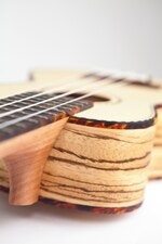 The 15-fret Reno RU210 Ukulele has a solid spruce top, and Zebra back and sides. This sweet sounding ukulele is appointed with a Tortoise shell binding and Fishbone rosette. Natural.