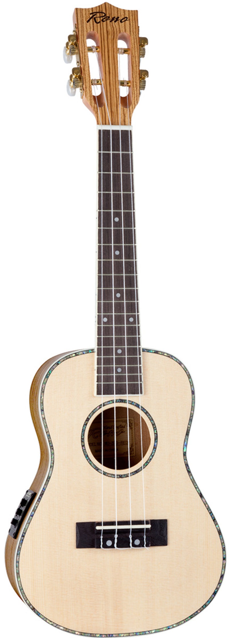 Article number 4333205The 18-fret Reno RU320E Grand Concert Ukulele including Belcat EQ electronics has a Solid Spruce top, and Zebra back and sides. This sweet sounding ukulele is appointed with a Abalone shell binding and sound hole rosette. Natural.