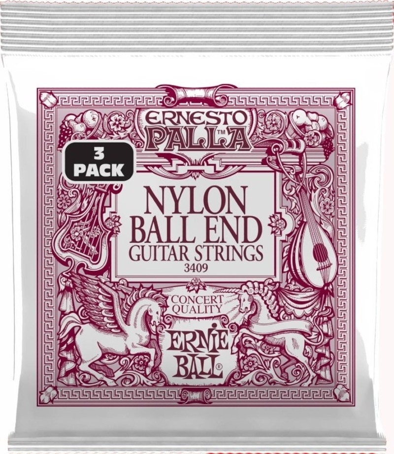 Ernie Ball Ernesto Palla concert quality classical guitar treble strings are made of black nylon monofilament. Gold wound basses are made of 80/20 bronze wrapped around a nylon multifilament core providing a smooth, rich tone. These strings feature ball end construction for faster, easier installation over traditional tie-end strings. All Ernie Ball strings are precision manufactured to the highest standards and most exacting specs to assure consistency, optimum performance, and long life.