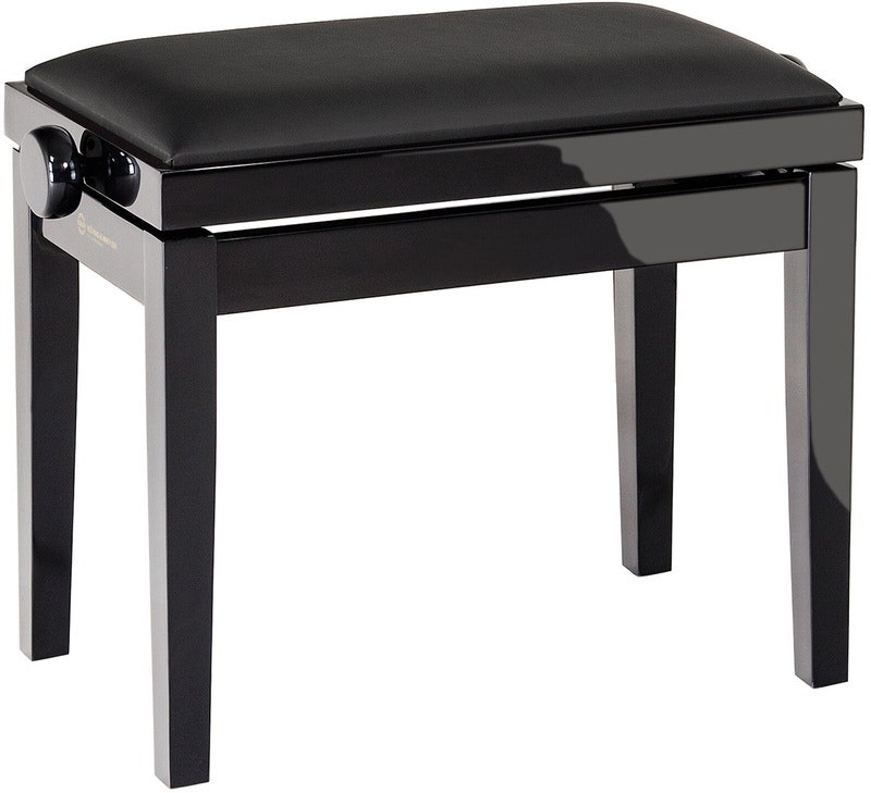 Complete piano bench of solid European beech wood, varnished with four coats of black glossy polyester finish. Stable legs with non-slip rubber end-caps. Dual crossbar mechanism for easy and precise height adjustment. Heavy duty seat cushion made out of MDF material with black imitation leather cover. The piano bench ships flat and is easy to assemble.