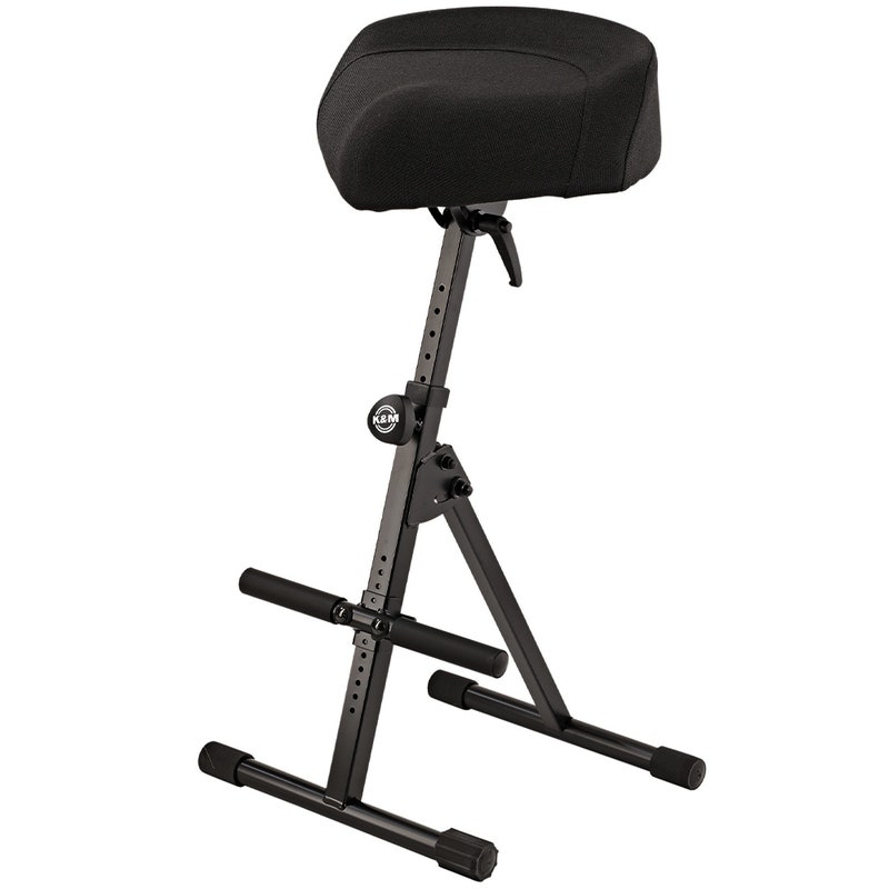 No matter whether you play guitar, keyboard or another instrument, this redesigned stool lends the right support for your back every time you play. The ergonomically shaped seat will perceptibly relieve pressure on your back and prevent premature tiredness. Moreover, the seat, which is covered with fabric, can be freely adjusted to any angle. The height can be adjusted from 600 to 900 mm to suit every individual. The practical and beneficial foot rest can also be height adjusted. The robust construction of the legs and the integrated foot end caps ensure the stool is sturdy and safe. The stool can be folded flat for transport