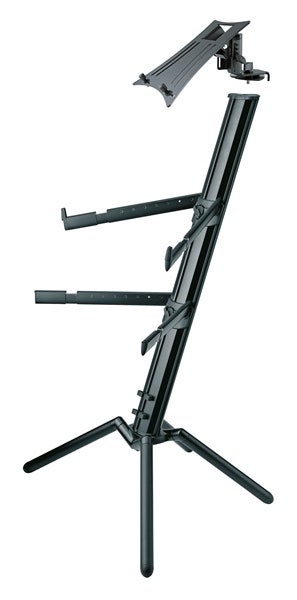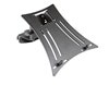 Appealing laptop attachment for »Spider Pro« and »Baby Spider Pro«. The laptop rest is mounted on the upper end of the keyboard stand »Spider Pro« or »Baby Spider Pro« by means of a wing nut and retaining plate. The aluminium shelf can be adjusted horizontally or inclined in three positions. Individually adjustable stop pins with rubber caps enable the use of all common laptop models, mixers, etc.