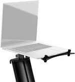 Appealing laptop attachment for »Spider Pro« and »Baby Spider Pro«. The laptop rest is mounted on the upper end of the keyboard stand »Spider Pro« or »Baby Spider Pro« by means of a wing nut and retaining plate. The aluminium shelf can be adjusted horizontally or inclined in three positions. Individually adjustable stop pins with rubber caps enable the use of all common laptop models, mixers, etc.