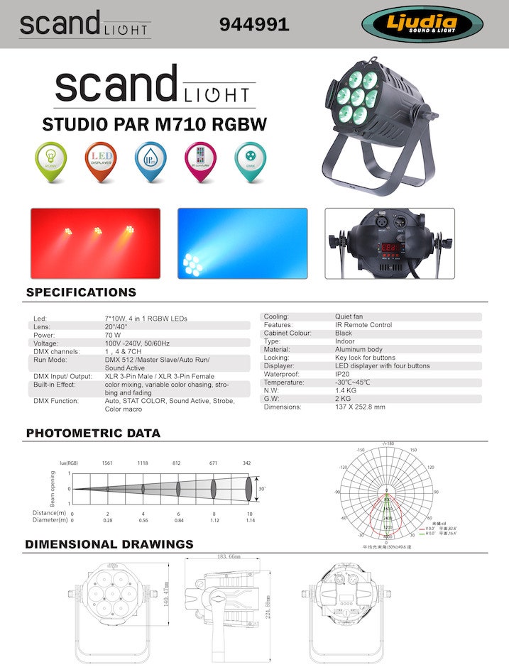 En kraftfull och snygg mini studio ljudarmatur i läcker design ifrån Scandlight. Chassit är gjutet i aluminium och armaturen är utrustad med hela 7st urstarka 10W RGBW LED-dioder. Scandlight studioPAR M710 RGB+W kan köras i DMX, Auto, Master/Slave eller i ljudstyrnings läge. Kan med enkelhet styras via den medföljande fjärrkontrollen. Armaturen är otroligt ljusstark trots sin smidiga storlek. Mängder av inställningsmöjligheter och användningsområden. Den tysta fläkten gör att den passar extra lämpligt till lokaler där det ska vara tyst i. Passar perfekt för att färgsätta väggar, lokaler, studios, band, scener mm.