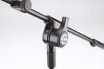 High-quality microphone stand with telescopic boom arm. Die-cast base with folding legs. Unique design retains all screws and levers without tension. Patented clamping lever can be fixed in any position, for holding mic cable, etc.