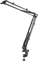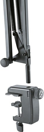 Flexible desktop microphone boom arm with 3/8" or 5/8" threaded connection for recording studios and multimedia workstations. Microphones, tablets or smartphones with a total weight of up to 0.8 kg can be easily and conveniently aligned and positioned. The microphone desk arm is supplied without cable and can therefore be equipped individually. Four useful cable clips are already included in the scope of delivery. With a clamping range from 0 to 48 mm, the clamp offers a wide range of mounting options. The sturdy metal frame with high-quality plastic inserts and non-slip support ensures secure and powerful clamping. Thanks to the specially shaped clamping surfaces, the clamp can be used on smooth surfaces as well as on round tubes. Optionally, the microphone boom arm can also be fixed with the additionally available table flange 23855.