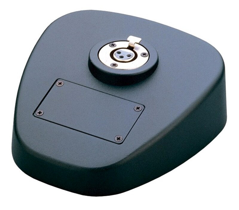 Black cast-iron base with a horizontally mounted XLR-style female socket on upper face. Removable plate, suitable for fitting switches, indicators, controls or connectors, with access to space for additional circuitry. Base is fitted with rear-mounted 3-pole XLR male connector.