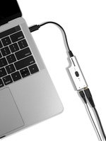 The UP1 is an analog-to-digital USB audio adapter with a 1/8” (3.5mm) microphone input and 1/8” (3.5mm) headphone output. It features a USB Type-C connector and includes a USB C to USB A adapter to connect to any computer.
