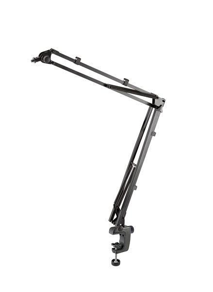Flexible desktop microphone boom arm with 3/8" or 5/8" threaded connection for recording studios and multimedia workstations. Microphones, tablets or smartphones with a total weight of up to 0.8 kg can be easily and conveniently aligned and positioned. The microphone desk arm is supplied without cable and can therefore be equipped individually. Four useful cable clips are already included in the scope of delivery. With a clamping range from 0 to 48 mm, the clamp offers a wide range of mounting options. The sturdy metal frame with high-quality plastic inserts and non-slip support ensures secure and powerful clamping. Thanks to the specially shaped clamping surfaces, the clamp can be used on smooth surfaces as well as on round tubes. Optionally, the microphone boom arm can also be fixed with the additionally available table flange 23855.