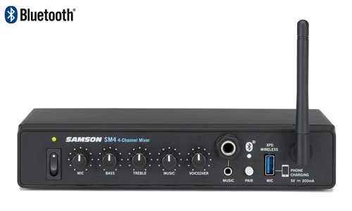 The SM4 rack mount mixer is a versatile tool for many sound applications. Featuring microphone and music inputs as well as Bluetooth® connectivity for streaming audio and a USB jack for connecting an optional Samson XPD USB Digital Wireless System.