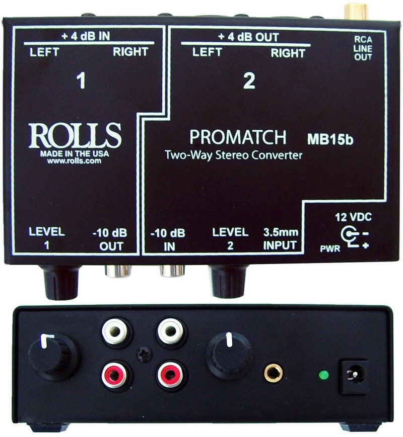 The MB15 ProMatch converts consumer level stereo RCA signals to balanced XLR professional line level, and back. One side of the unit, labeled 1, has two XLR inputs and stereo RCA outputs. The other side labeled 2, has stereo RCA inputs and two XLR outputs. Each side has stereo level controls, and an LED indicates that power is applied to the unit. An additional benefit of the MB15 is that it will act as a balanced XLR line level control. By adding a stereo pair jumper between the four RCA jacks (connecting ins to outs), the two Level controls may be inserted into any balanced XLR line.