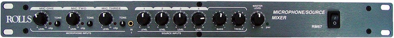 RM67 is a single rack space mixer designed for the install/contractor market. The unit mixes three balanced microphones with four stereo sources to mono or stereo balanced outputs. The XLR Microphone Inputs have Mic/Line level switches, a send/return Insert jack, and individually switchable +12 VDC phantom power.