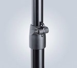 Steel tube combination for use in subwoofers with flange adapter. The height is fixed with a safety hook and secured by a clamping screw for a vibration-free and firm fit. The slim design of the clamp allows space-saving transport and ensures a stylish appearance. The usable height is between 955 and 1,480 mm and is adjusted in 3 steps of 175 mm. A useful mounting aid also facilitates the installation of the speaker.