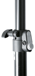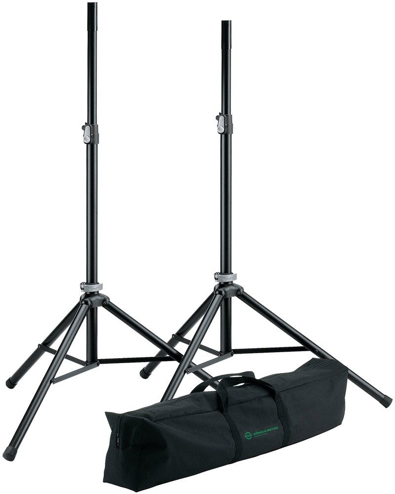Two easy-to-carry speaker stands made of high quality aluminum in a carrying case. Fiberglass-reinforced fittings and a compact clamp with a patented push-button system affords user-friendly height adjustment and ensures stable support for the speakers. The leg construction adjusts by an easy-to-use clamping lever.