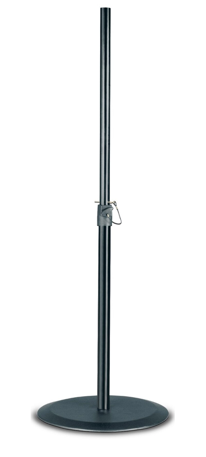 Stable steel stand with broad completely level round cast-iron base-diameter 450 mm. Rod combination height adjustable using clamping screw and safety splint. Speaker will be fixed with flange adapter. Also available as monitor stand (Order No. 26740-000-55).