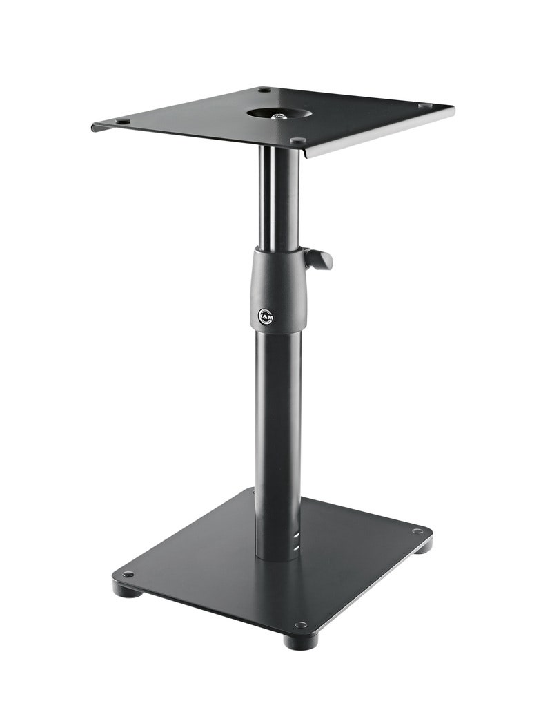 Height-adjustable desktop stand for near-field monitors. The solid metal construction with the large support plate (205 x 245 mm) is suitable for a wide range of monitors and other equipment in the same size range. Four felt-covered support pads provide decoupling under the base plate. The individual height can be adjusted in 6 steps between 350 and 500 mm. In terms of load capacity, the stand can be centrally loaded up to 25 kg. Rubber pads are included for secure, noise-insulating support of the monitors.