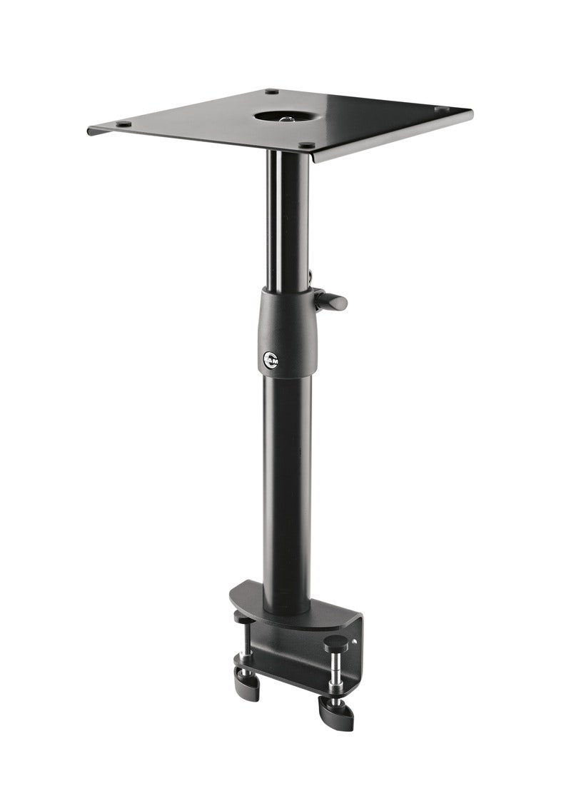 Height-adjustable monitor stand with table clamp for near-field monitors. The solid metal construction with the large support plate (205 x 245 mm) is suitable for a wide range of monitors and other equipment in the same size range. A practical table clamp allows it to be attached to tabletops with a thickness of 10 to 52 mm. The individual height adjustment is possible in 6 steps between 335 and 485 mm. In terms of load capacity, a centric load of up to 25 kg is possible. The support plate can be rotated 360° for perfect alignment. Rubber pads are included for secure, noise-insulating support of the monitors.