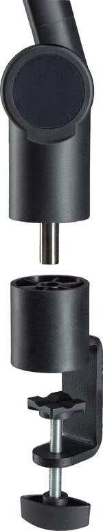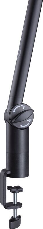 The stylish and slim microphone arm has a threaded connection in 3/8“or 5/8” and is equipped with an innovative table clamp that enables fast and flexible positioning of microphones in studios or multimedia work environments. Thanks to the integrated cable management, the cables are stowed in the cable channel to save space and remain invisible. Microphones weighing up to 1 kg are held easily in any desired position. The clamp, which covers a clamping range of 3 to 50 mm, offers a wide range of mounting options. The scope of delivery also includes a table flange that enables stationary mounting.