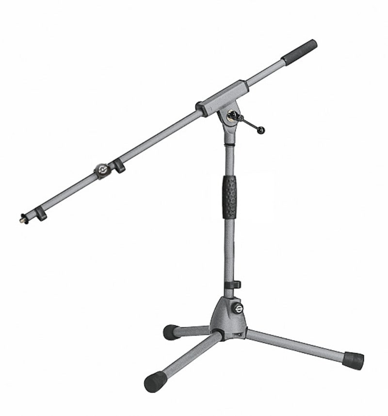 Low-level, telescopic stand with foldable legs. Comes with 2-piece boom arm. Attractive gray Soft-Touch powder coating.