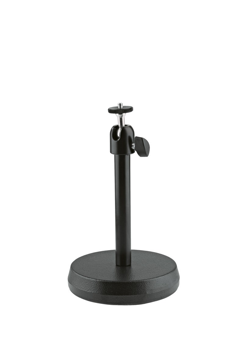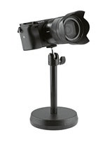Stable desktop camera stand for mounting compact cameras, action cameras, web cams, mini-projectors and mobile recorders with a 1/4" connection thread. The ball joint allows the mounted equipment to be rotated 360° and fixed in any position. The tilt-angle is infinitely adjustable up to 90° and the load capacity is designed for equipment up to 1 kg.