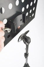 Powder-coated, perforated steel music stand with plastic connecting elements. The music stand rest can be attached and removed using the plastic, user-friendly, quick-release lock. There is a large, easy-to-use wing nut making adjustment of the tilt easy. The stand can be freely adjusted to any height using the non-scratch tension sleeve.