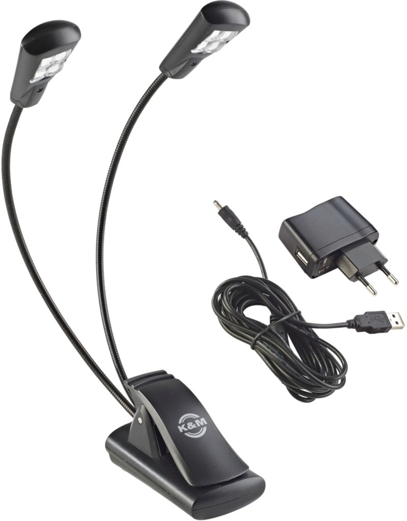 Powerful and multifunctional dual-headed light with 2 flexible goosenecks which allow the musician to focus light to a pinpoint or evenly over a larger area. The light provides comfort and versatility to accommodate a variety of lighting needs through 4 powerful LEDs rated for 100,000 hours on each head and two brightness settings. The latest LED technology guarantees a bright light source and minimal energy consumption. A practical and extra-wide clip provides for easy attachment to all music desks or table tops with a thickness of 25 mm. The light is powered by 3 (1.5 V AAA) batteries (included) with a typical battery life of 10 hours. The light comes with a 5 V power adapter and a 3 m cable as well.