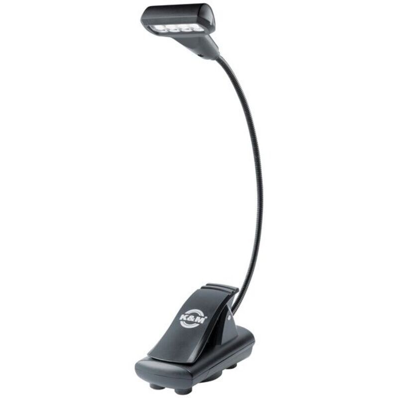 The attractive T-Model music stand light with 4 LEDs provides a pleasant warm white light with a color temperature of 3000 Kelvin. With 2 brightness settings and the adjustable gooseneck the T-Model provides comfort and versatility to accommodate all sorts of lighting needs. The extra-wide clip (up to 25 mm) attaches to music desks, table tops etc. It can also be used as a standing light. The T-Model is powered by 3 (1.5 V AAA) batteries (included) with a typical battery life of 10 hours or an AC adapter (not included).