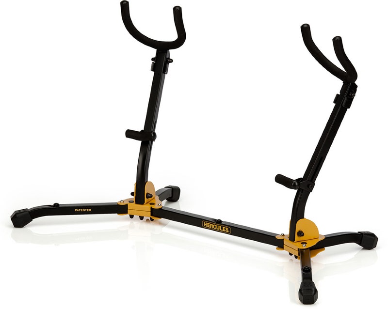 The HERCULES Double Saxophone Stand DS537B features the one-piece folding design with locking pins and can support up to 44 pounds total instrument weight.