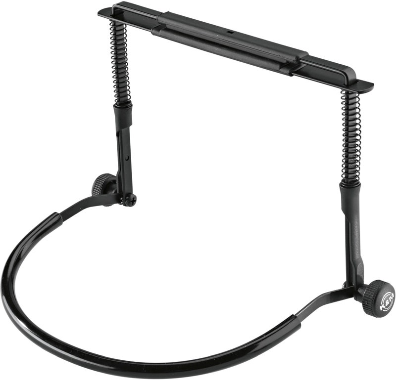 Particularly suitable for blues harmonica models. Molded rubber sections on the support arms hold the instrument securely. Easily adjusted by spring tension and two knurled screws. The neck frame has a soft rubber covering for extra comfort.