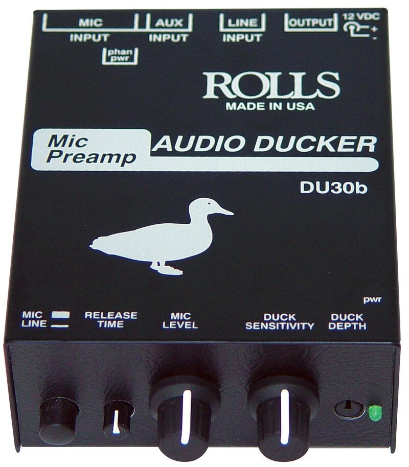 The DU30b is a microphone preamp and background music preamp. When an announcement is made into the microphone, the music is automatically "ducked" under the announcement. Then the music is brought back to it's previous level.