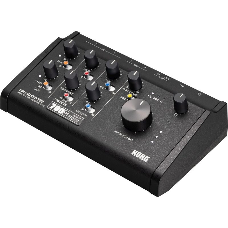 The microAUDIO 722 is a premium audio interface featuring the legendary analog filter from the miniKORG 700S, renowned for its warm, musical character and responsive behavior.
